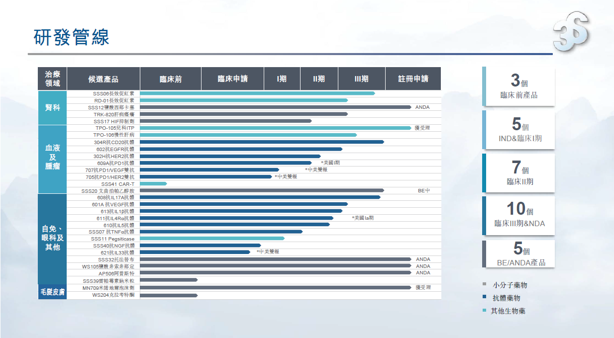 2023上半年,集团拥有30项在研产品,包含血液/肿瘤科10项,自身免疫及眼科13项,肾科5项,皮肤毛发领域2项。截至目前,已有10款新药推进至临床III期或NDA申报阶段,5款仿制药品种处于BE及ANDA申报的阶段。